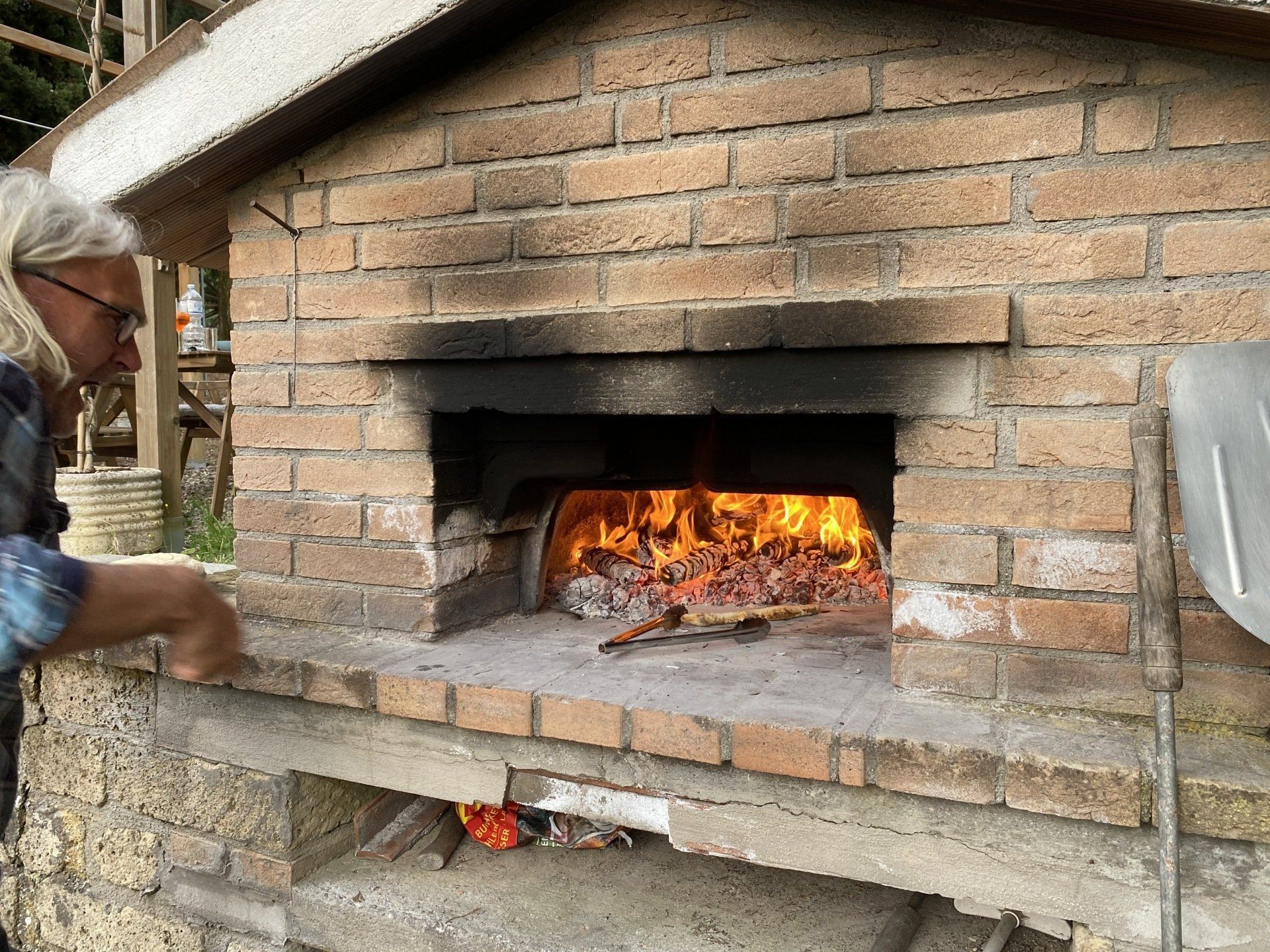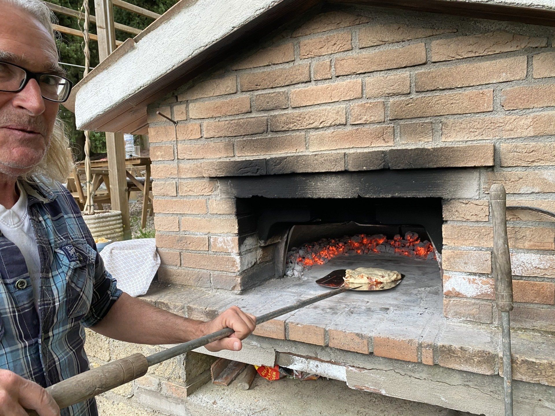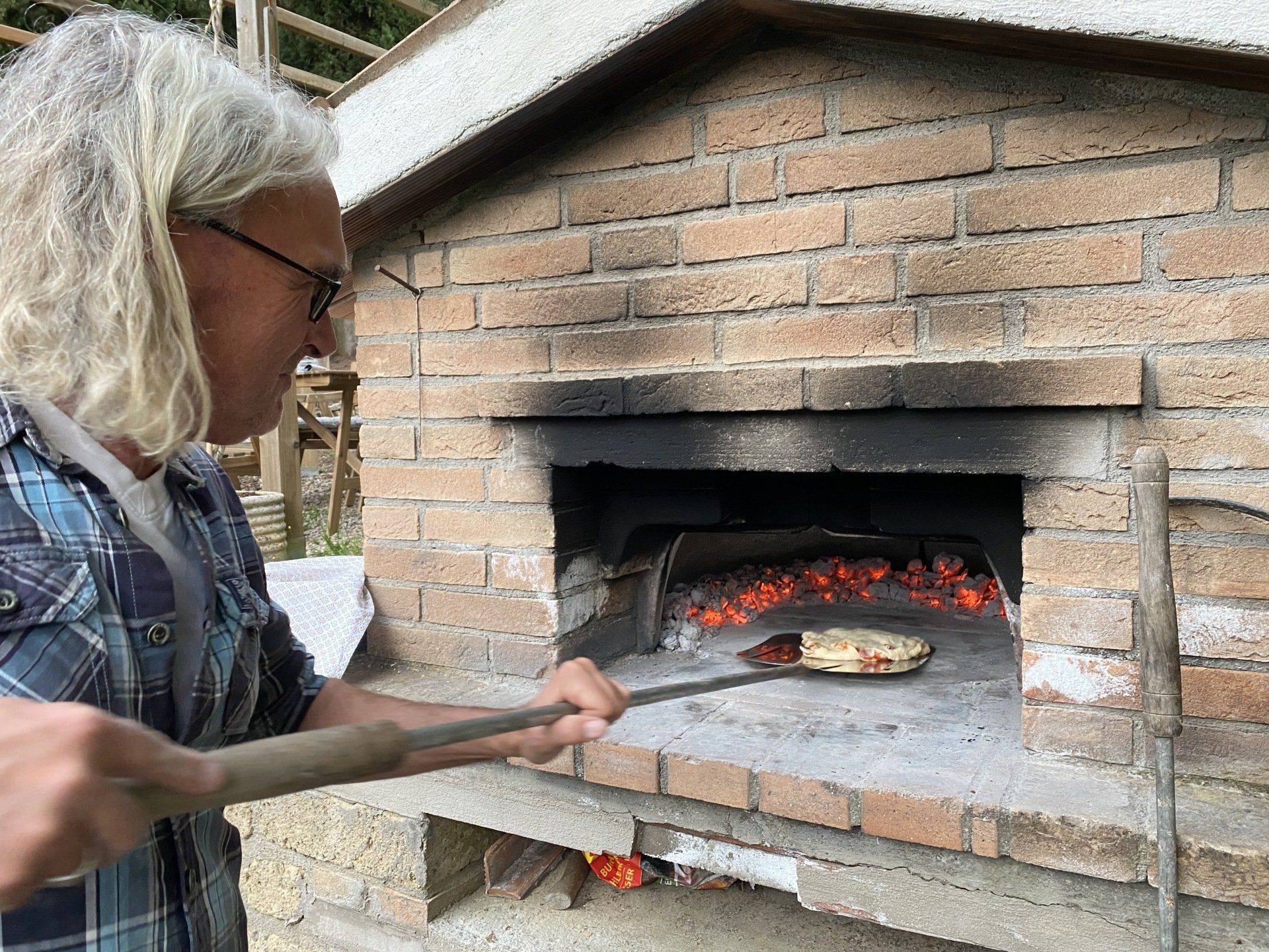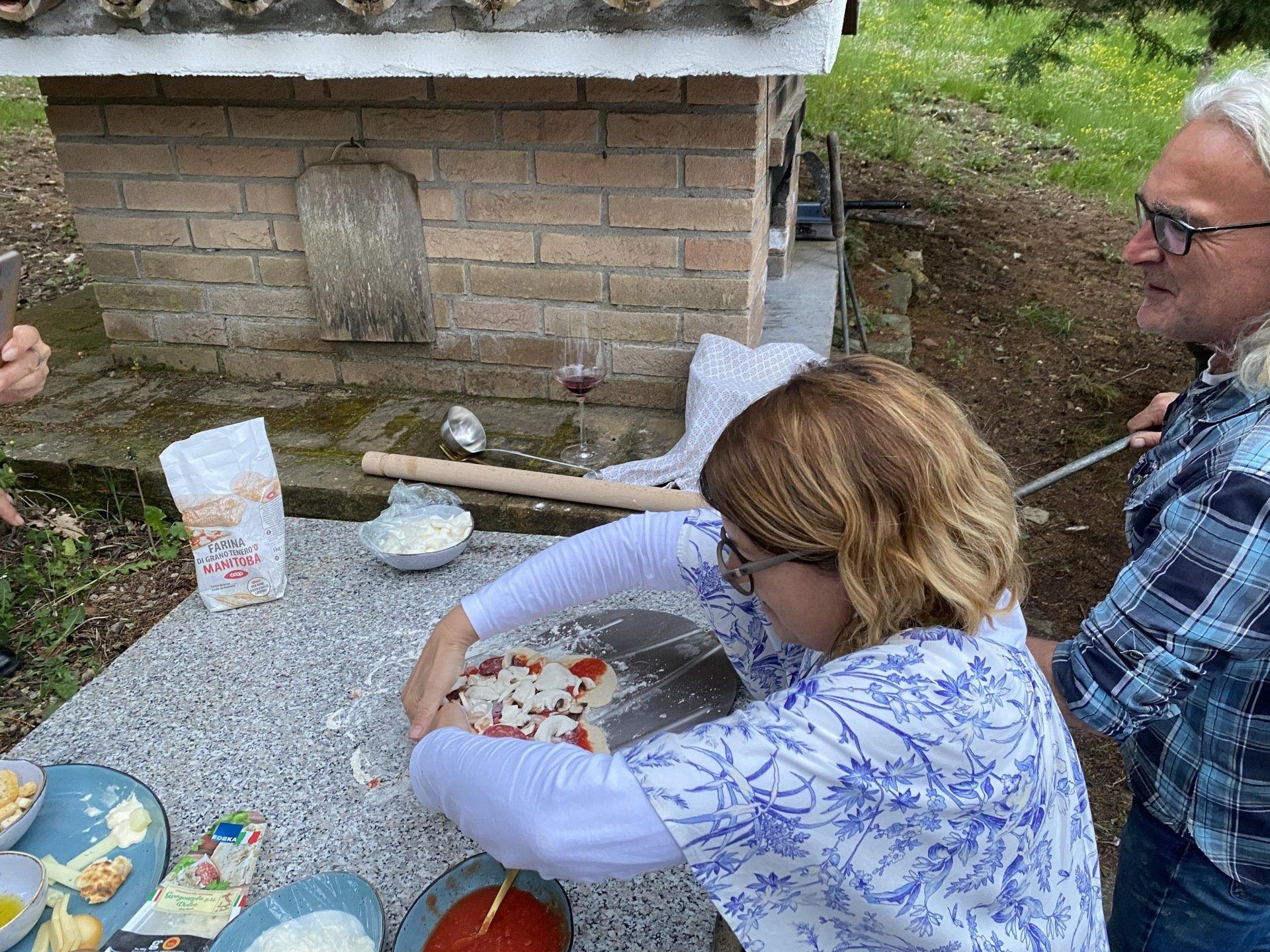 Natürlich muss man in Italien nicht unbedingt selber Pizza machen. Wir haben aber einen Brotbackofen und beschließen, ihn heute zu testen. Der erste Teig misslingt! Nachdem wir dann aber Backpulver von Hefe unterscheiden können (auf beiden Tüten steht Lievito) entsteht doch noch ein toller Hefeteig. Wir belegen mit allem, was die Küche hergibt und dann macht Pizza backen richtig Spaß. Das Ergebniss war geschmacklich sensationell. An der Optik arbeiten wir noch.
